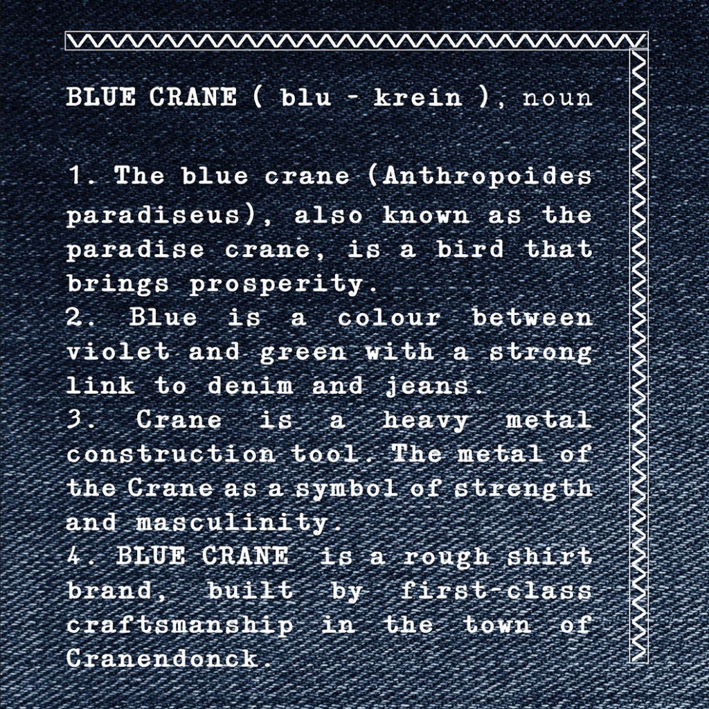 Vanaf de start in voorjaar 2016 heeft het merk Blue Crane een duidelijk doel: een stoer, comfortabel kwaliteitsoverhemd voor de jongere man passend in de denim fashion wereld. Kwaliteit, vakmanschap en passie staan aan de basis van dit stoere overhemdenmerk. Uiteraard gecombineerd met gevoel voor fashion en het gebruik van comfortabele stoffen en pasvormen.